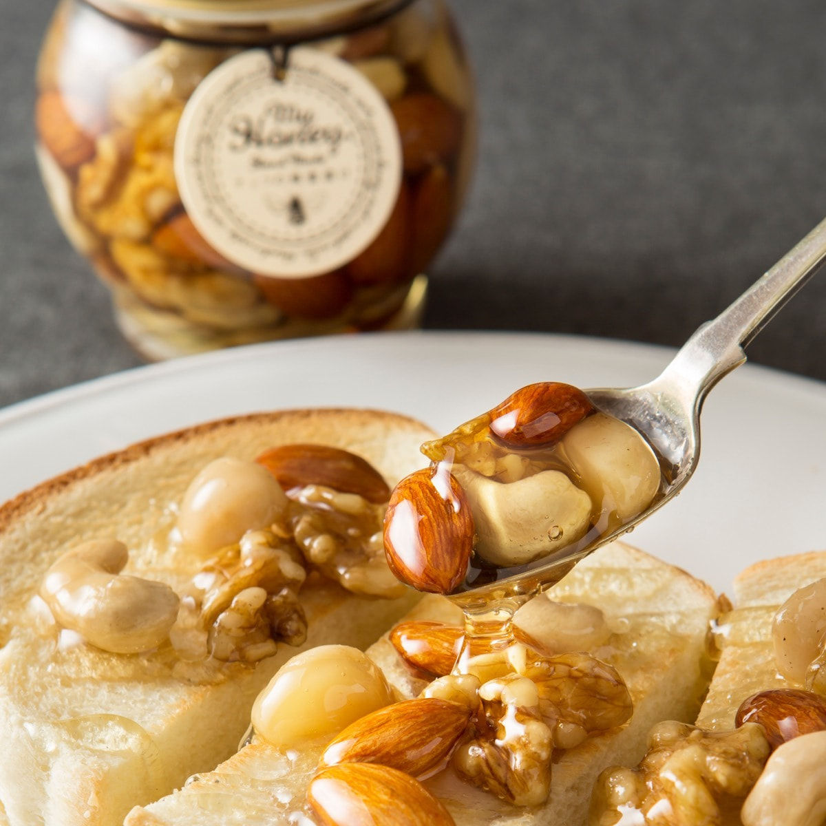 モデルの間食としても注目されるミネラル豊富なナッツをハンガリー産の非加熱アカシア蜂蜜で漬け込みました。